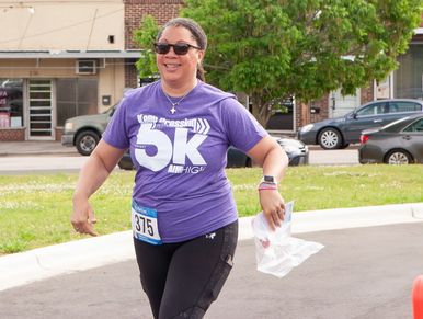 Tara crossing the finish line at the 2022 Keep Pressing 5K. Being an active participant of programs.